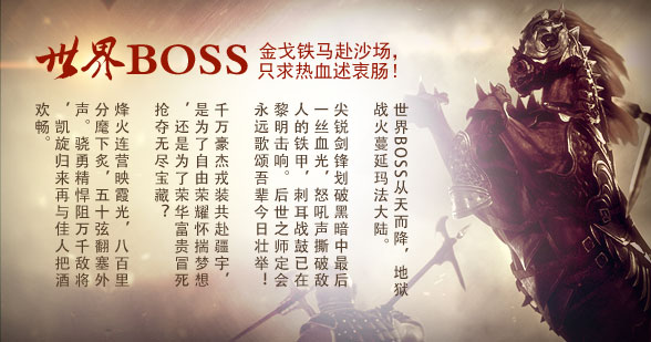 - 世界BOSS活动为每周日晚8点开启,所有加入战盟的玩家均可报名参加,活动分为2个阶段,第1阶段为活动开始BOSS血量30%为强制和平阶段,第2阶段为BOSS血量30%至BOSS死亡为强制PK阶段,所有玩家自动切换为战盟模式。